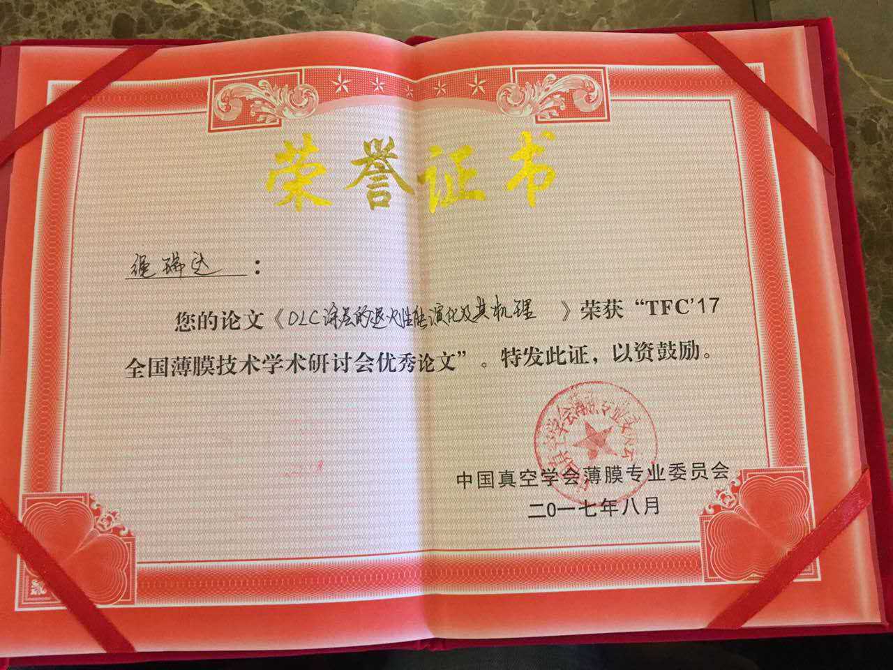 TFC’17全國(guó)薄膜技術學(xué)術研讨會(huì)優秀論文榮譽證書
