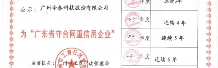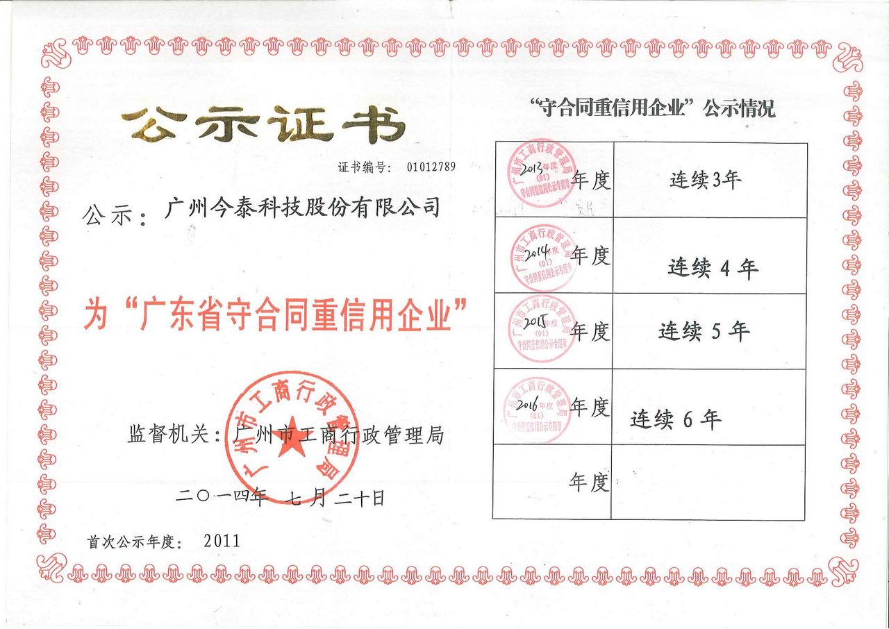 近日,廣州市工商行政管理局(以下簡稱“市工商局”)發(fā)布“關于廣州市2016年度‘守合同重信用'公示企業(個體工商戶)的公告”,經(jīng)市工商局的嚴格評審認定,廣州今泰科技股份有限公司(以下簡稱“公司”、“今泰科技”)被(bèi)授予2016年度“廣東省守合同重信用企業”榮譽稱号并頒發(fā)公示證書。此爲公司自2011年以來,連續六年獲此殊榮。